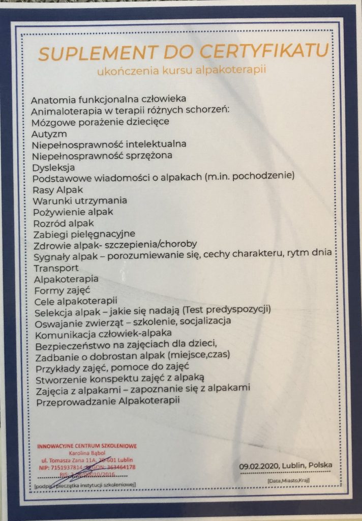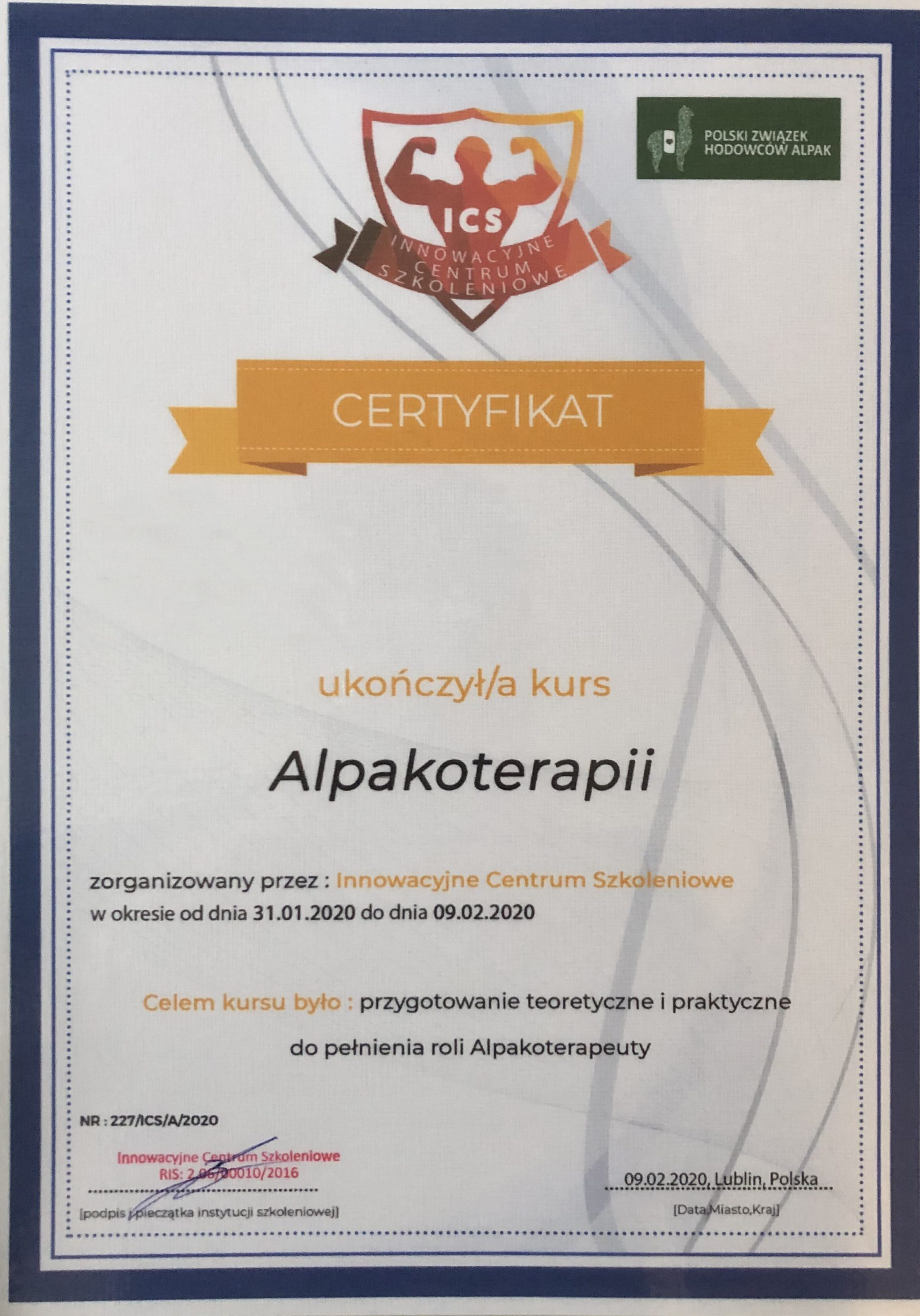 Zajęcia, które mają na celu stworzenie pozytywnego kontaktu pomiędzy uczestnikami a alpaką. W trakcie spontanicznej, radosnej zabawy (ukierunkowanej przez prowadzącego) uczestnicy przyzwyczają się do kontaktu ze zwierzęciem, głaszczą go, wydają polecenia.