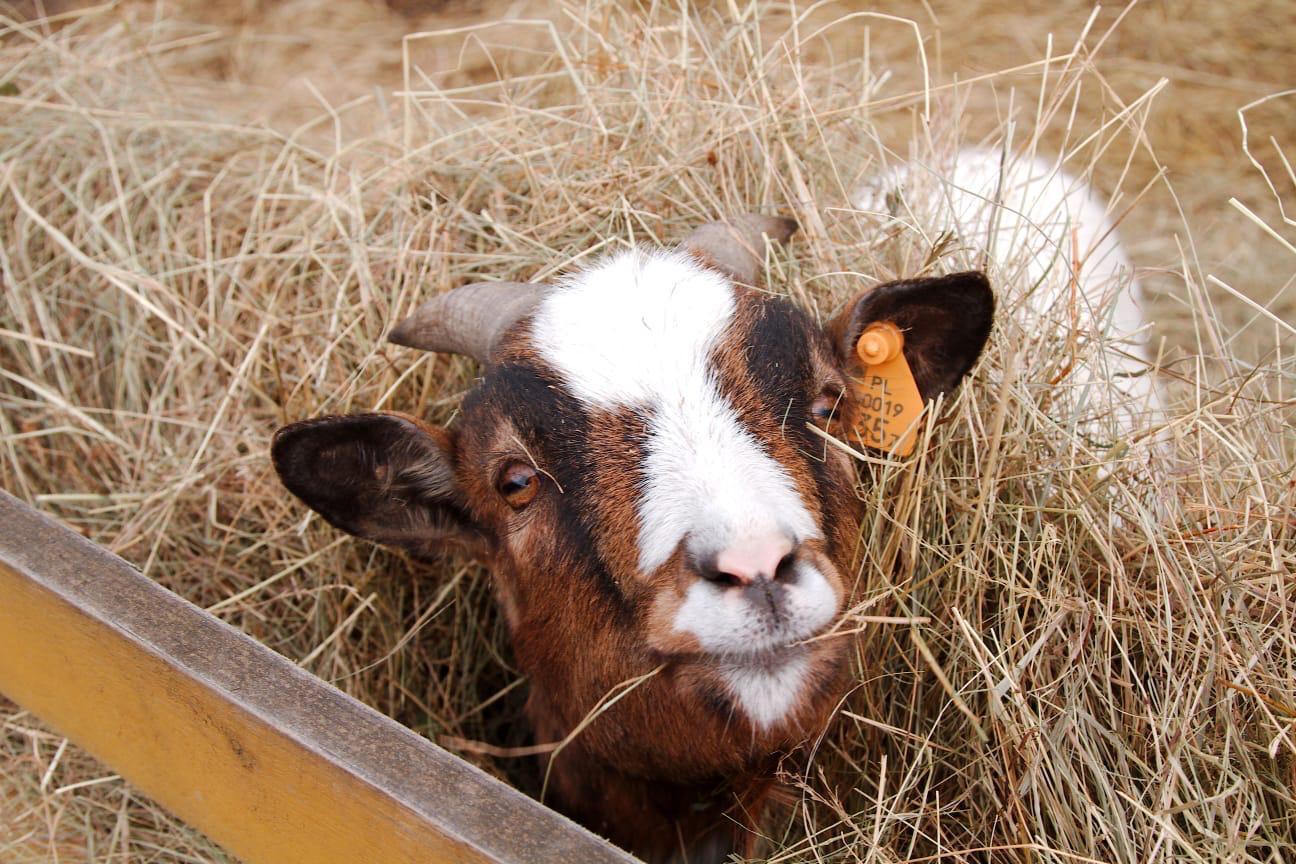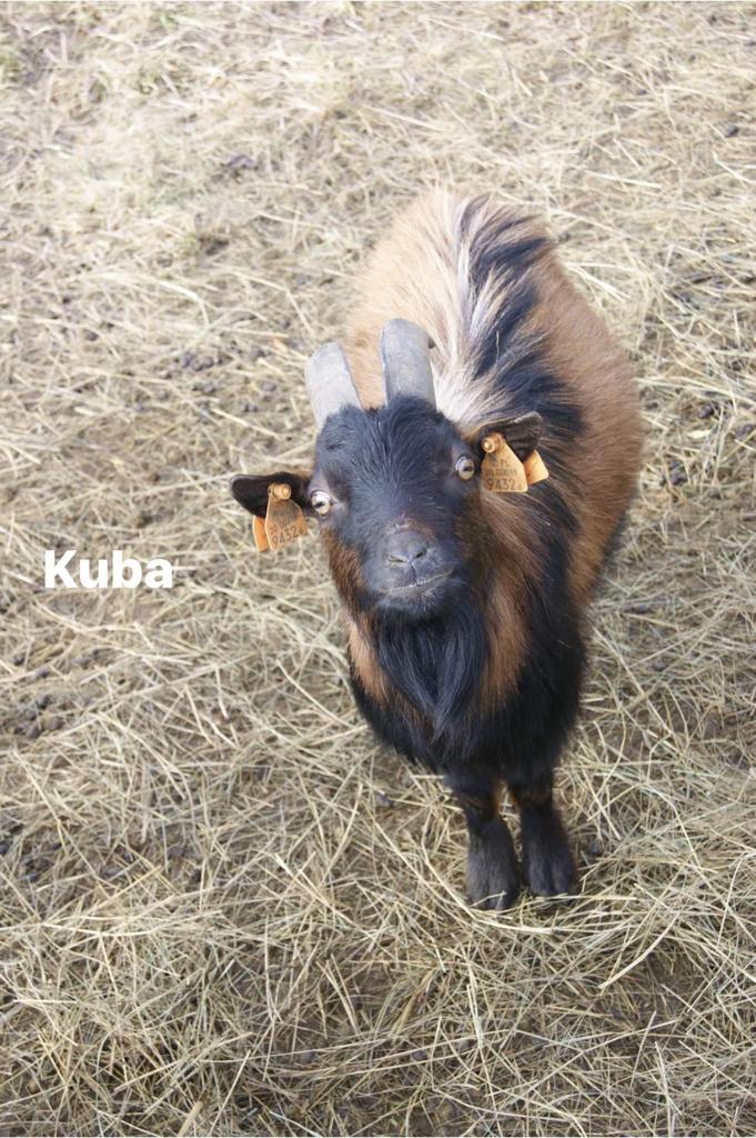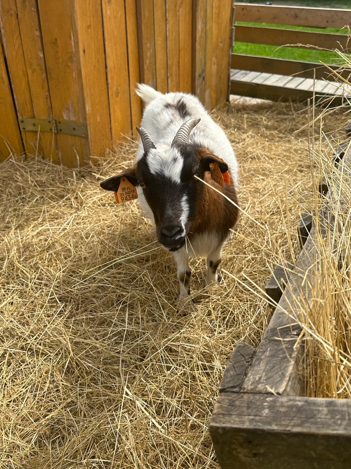 towarzyszy Murzynowi na wybiegu, jest to koza miniaturowa z zaokrąglonymi do tyłu rogami