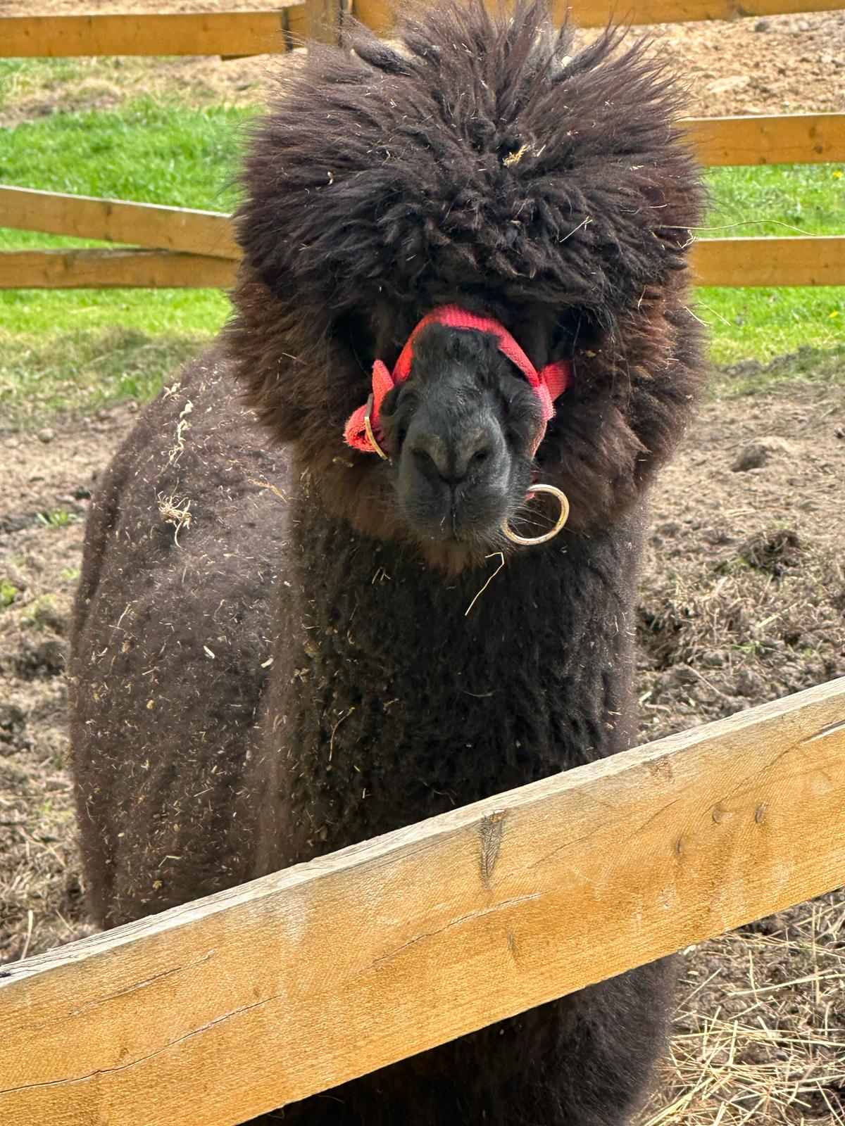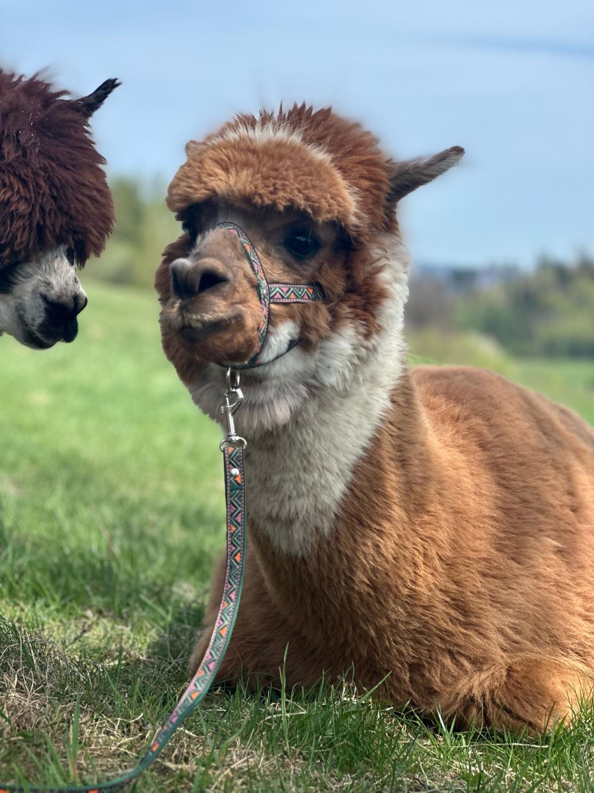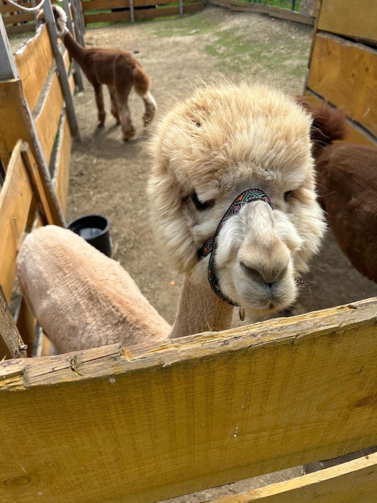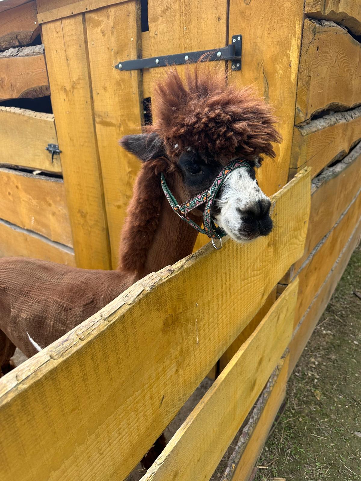 dwukolorowa, przyjacielska alpaka rasy huacaya, zawsze pierwsza na spotkanie ( zwłaszcza gdy pojawiają się marchewki)